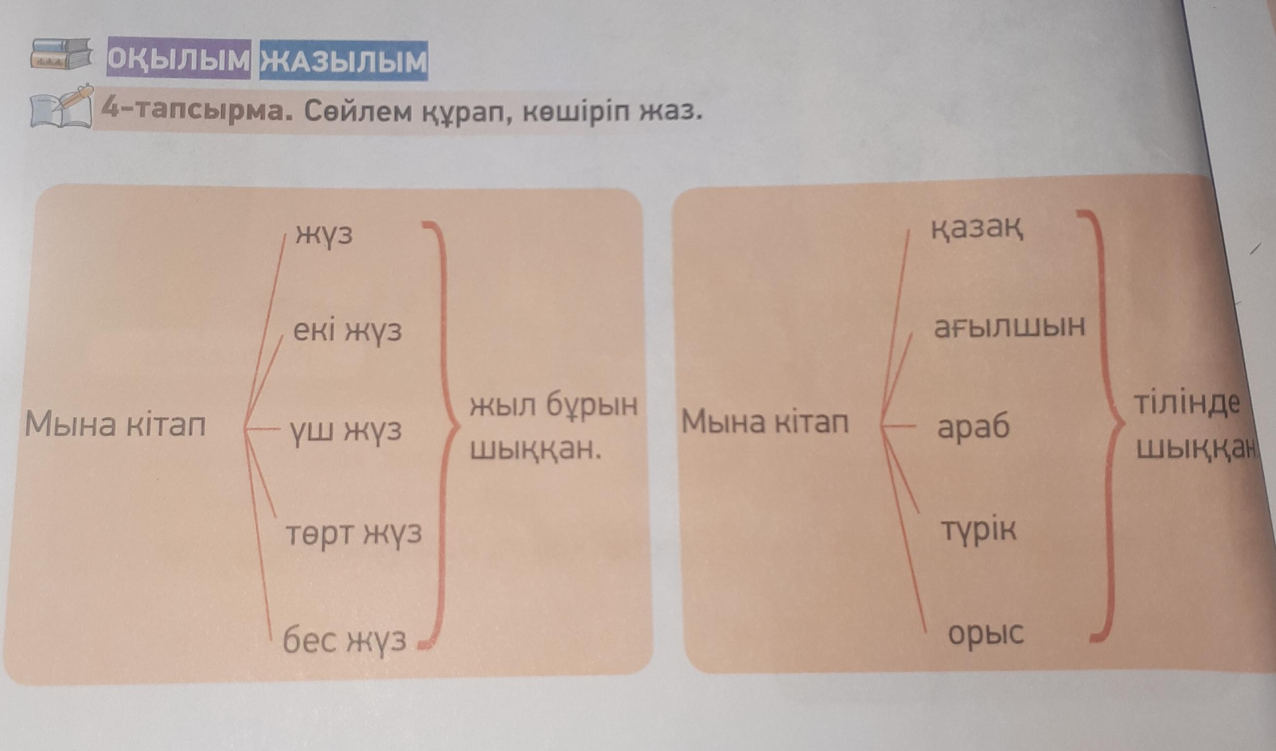 можно выбрать любую например: мына кітап төрт жүз жыл бұрын шыққан; мына кітап араб тілінде шыққан