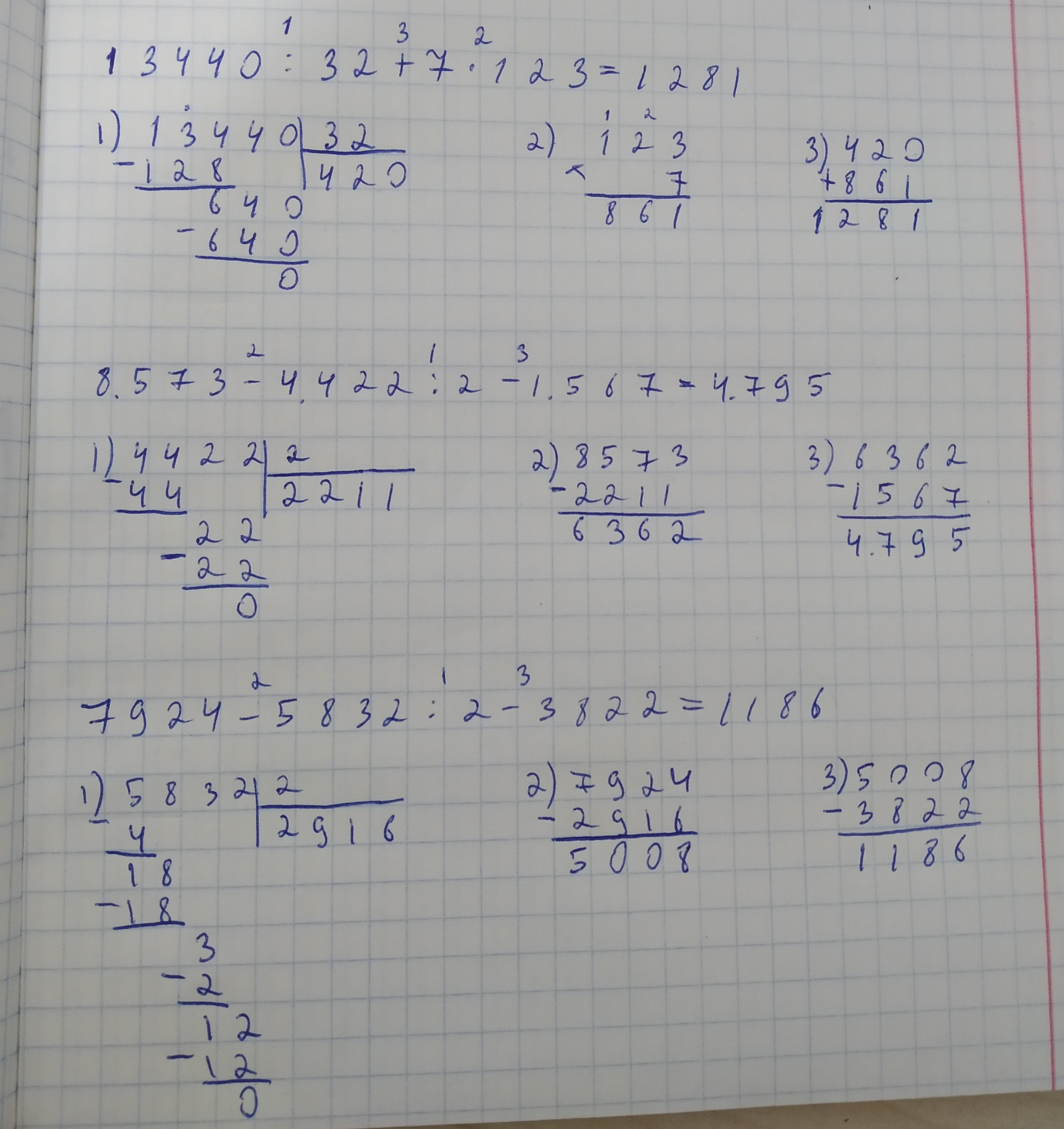8 вычисли записывая по действиям 13440:32+7*123 8573-4422:2-1567 7924-5832:2-3822 СТОЛБИКОМ!!!!!!!!!!!!!!!!!!!!!