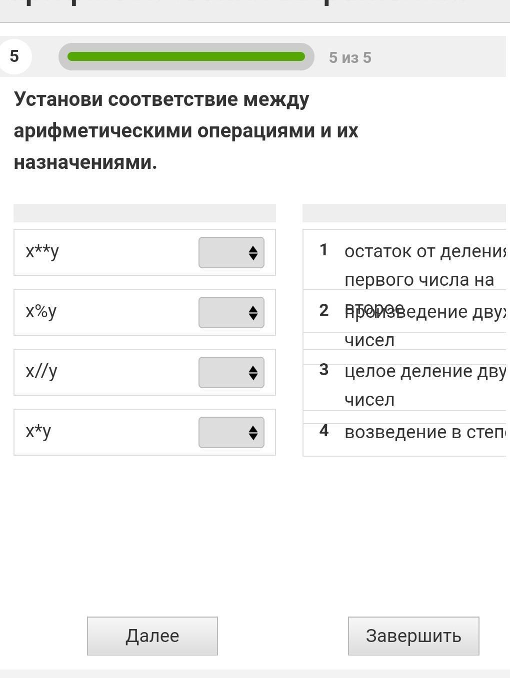 x**y-возведение в степень x//y-целое деление двух чисел x%y-остаток деления. x*y-произведение двух чисел