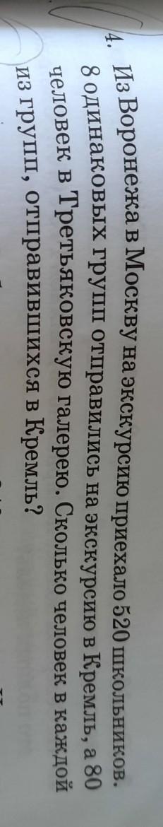из Воронежа в Москву на экскурсию приехало 520 школьников 8 одинаковых групп Отправились на экскурсию в Кремль а 80 человек в Третьяковскую галерею Сколько человек в каждой из группы отправившихся в Кремль