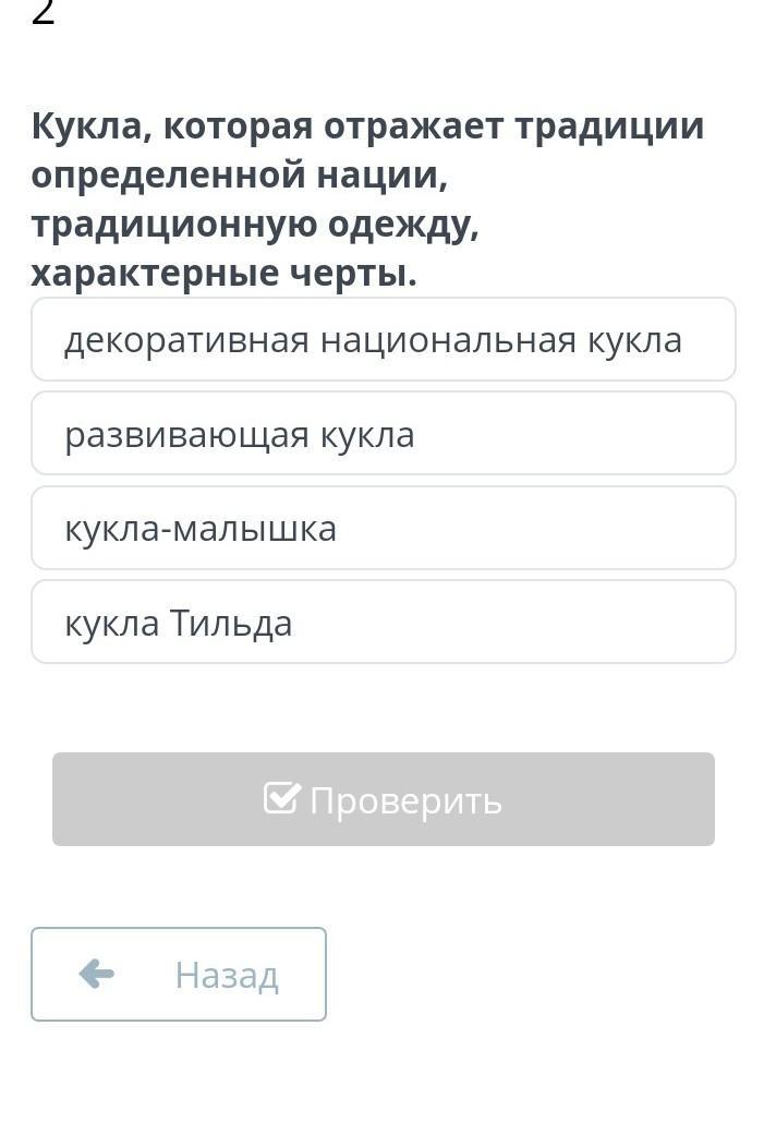 Ответ декоративная национальная кукла, потому что она национальная, ее используют в разных странах, у каждой страны она своя. Почему не развивающая кукла , кукла-малышка , кукла Тильда? Потому что развивающая кукла развивает моторику рук, с ней играют, кукла-малышка это маленькая кукла с ней тоже играют, кукла-Тильда это декоративная кукла не предназначена для игры.