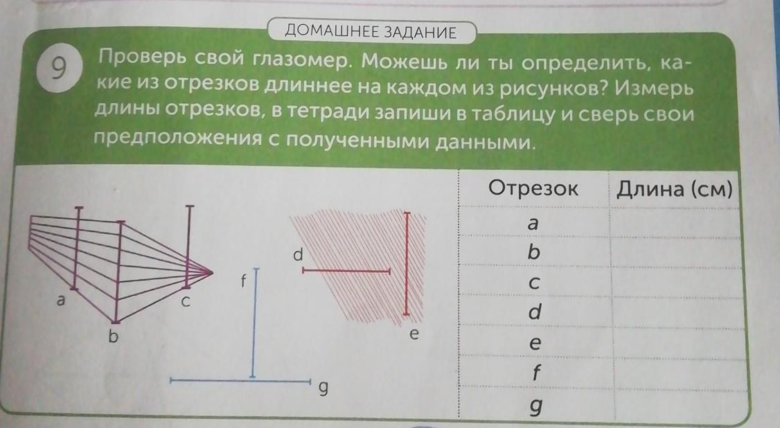 длины отрезков, в тетради запиши в таблицу и сверь свои
