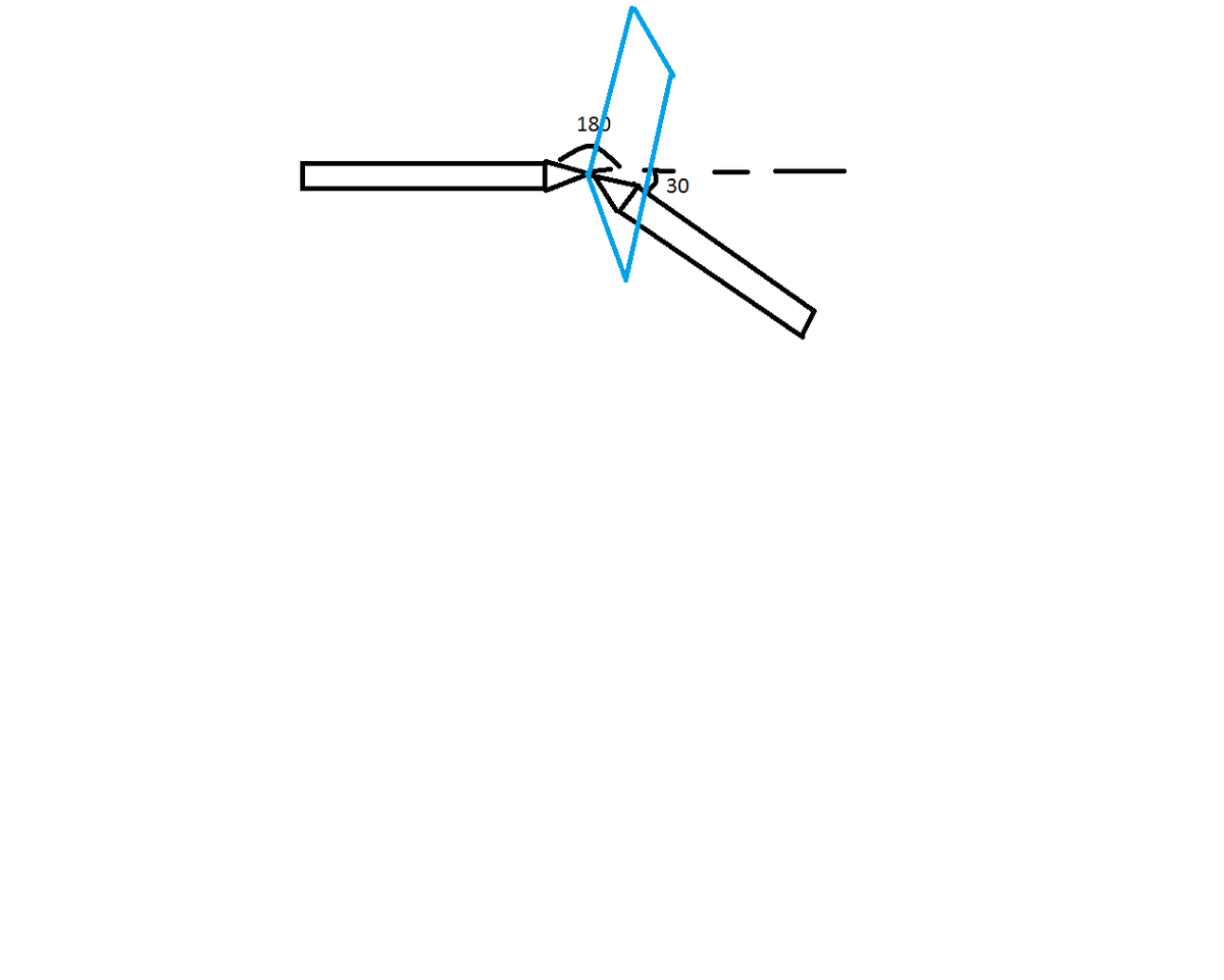 Перед плоским зеркалом, составляющим с вертикалью угол a = 30 градусов, расположен карандаш так, что его изображение в зеркале лежит в горизонтальной плоскости. Под каким углом друг к другу расположены карандаш и его изображение?
