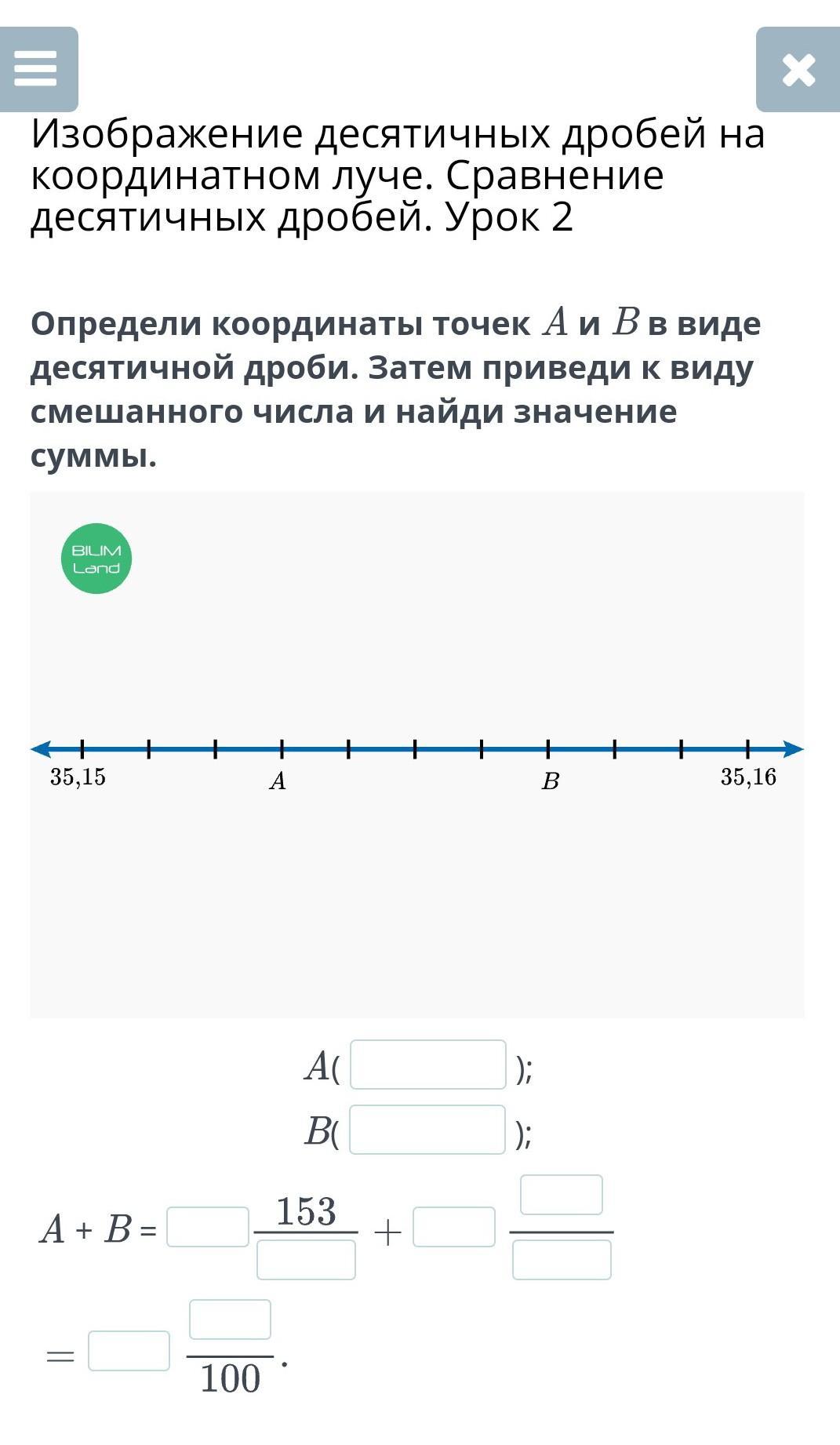 оредели координаты точек А и В в виде десятичной дроби. Затем приведи к виду смешаного числа и найди значение суммы. Помогите пожалуйста в онлайн мектеп