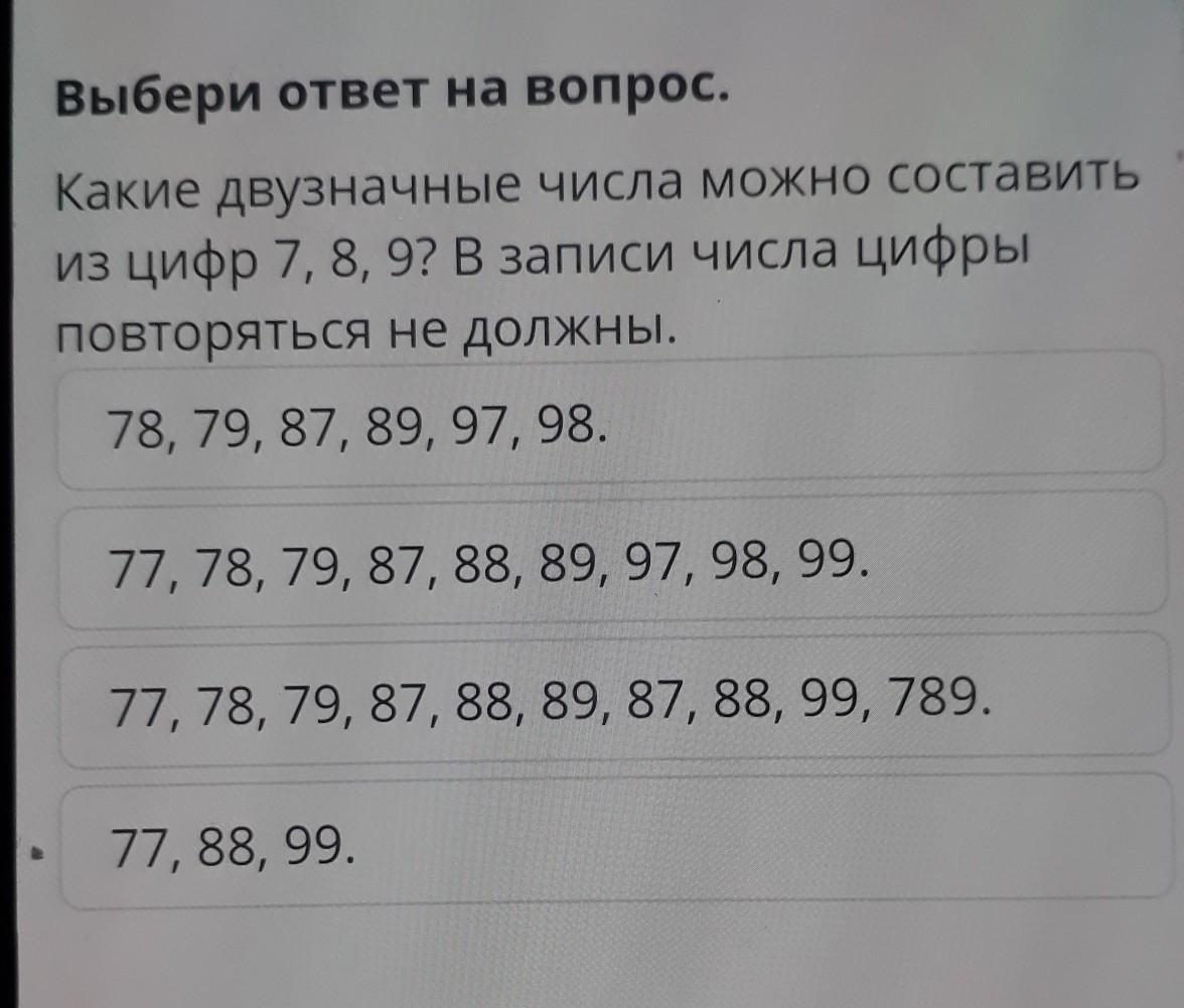 Среди цифр нет нуля, поэтому на первой позиции в двузначном числе может быть любая из 3 цифр (то есть 7, 8 или 9). Но по условию задания цифры не могут повторяться, поэтому на второй позиции в двузначном числе может быть любая из двух цифр, не равная первой.