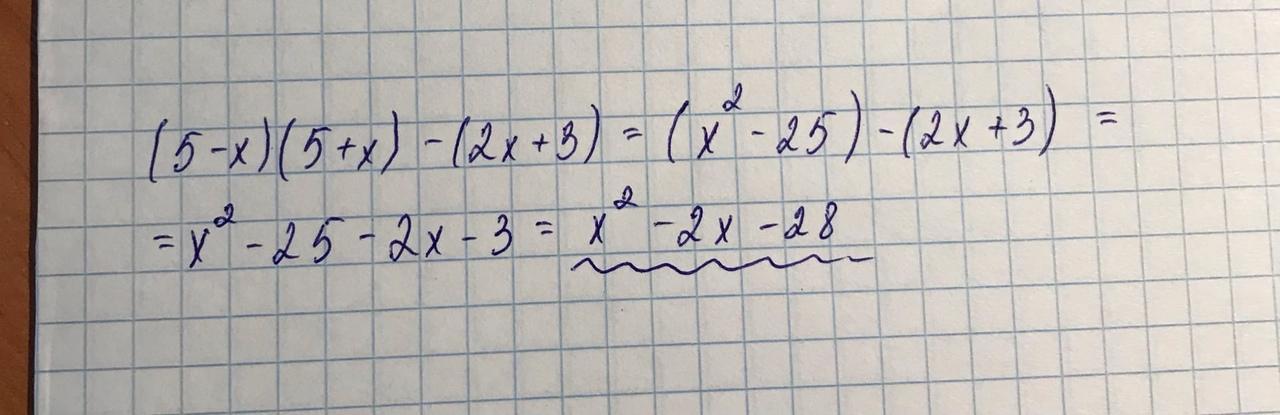 Пошаговое объяснение:(x-5)(x+5)-(2x+3)=x^2-25-2x+3