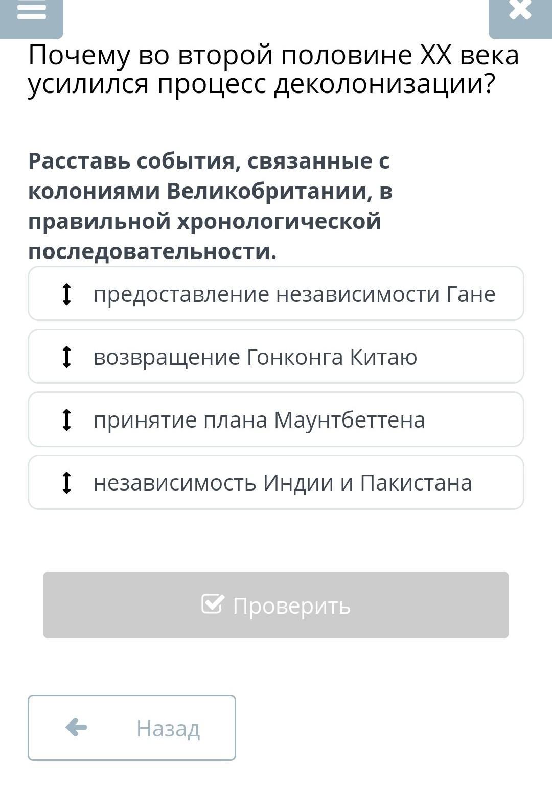 Ответы по порядку: Принятие плана Маунтбеттена, независимость Индии и Пакистана, независимость государства Гана, возвращение Гонконга Китаю.