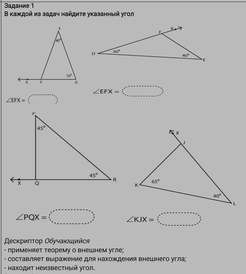 угол EFX = 40° + 30° = 70°