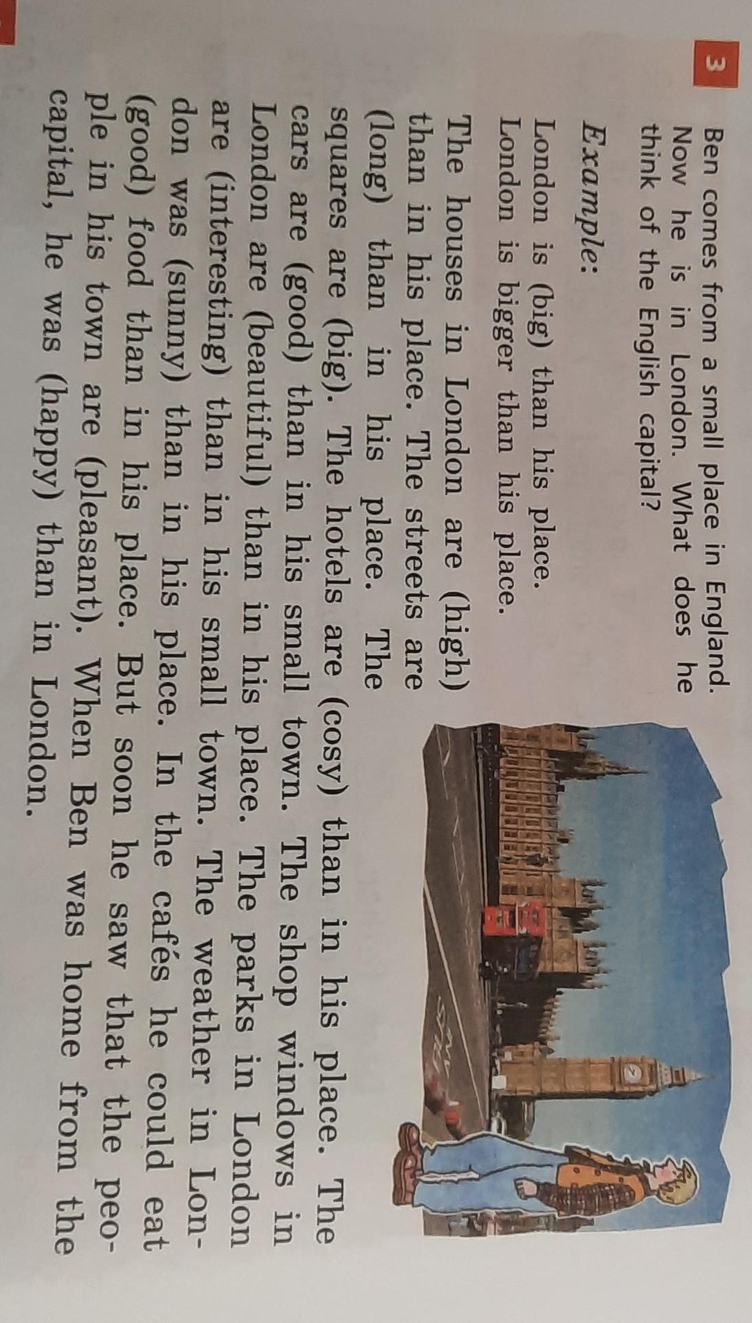 than in his place. The streets are longer than in his place. The squares are bigger. The hotels are cosier than in his place. The cars are better than in his small town. The shop windows in London are more beautiful than in his place. The parks in London are more interesting than in his small town. The weather in London was sunnier than in his place. In the cafés he could eat better food than in his place. But soon he saw that the people in his town are more pleasant. When Ben was home from the capital, he was happier than in London.