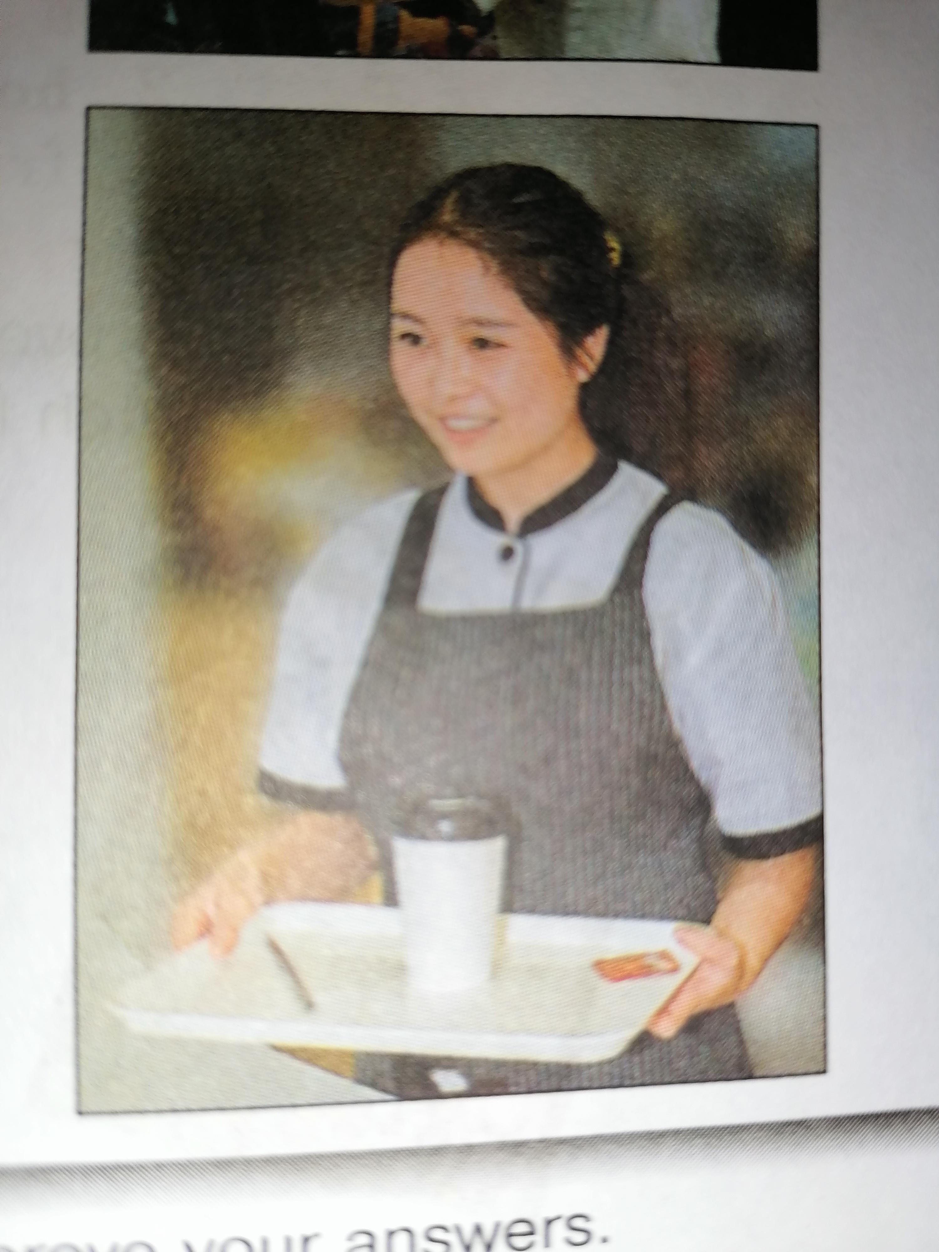We can see a waitress on the picture. She dressed in special uniform. She keeps a tray with a cup of coffee in her hands