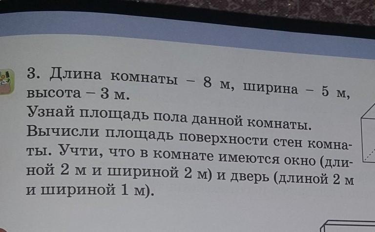 длина комнаты 8 м ширина 5 м высота 3 м узнай площадь пола данной комнаты вычисли площадь поверхности стен комнаты учтите что в комнатешириной 2 м и дверь длиной 2 м и шириной 1М