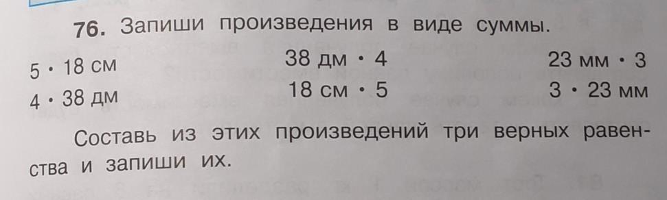 76. Запиши произведения в виде суммы. Составь из них произведений три верных равенства и запиши их