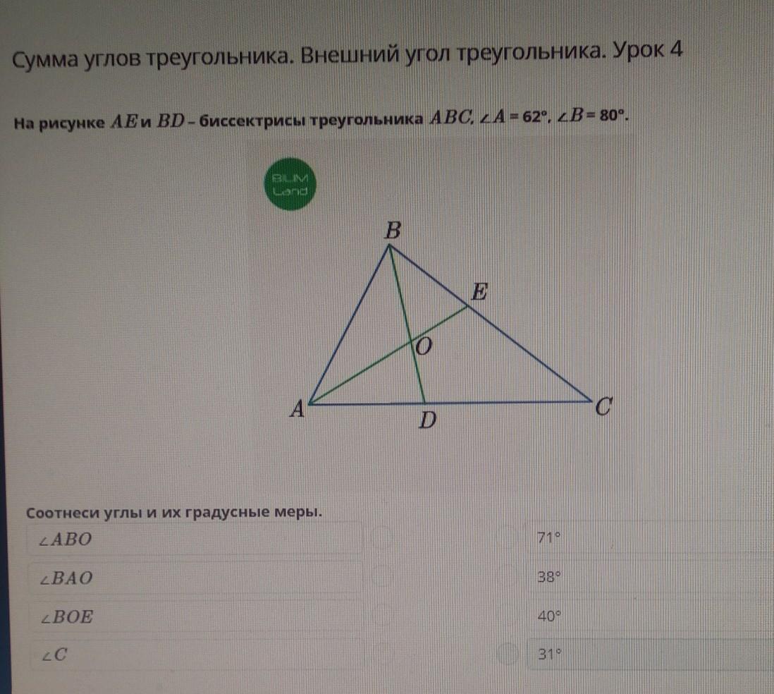 На рисунке AE и BD - биссектрисы треугольника ABC, A = 62°, 2B = 80°.