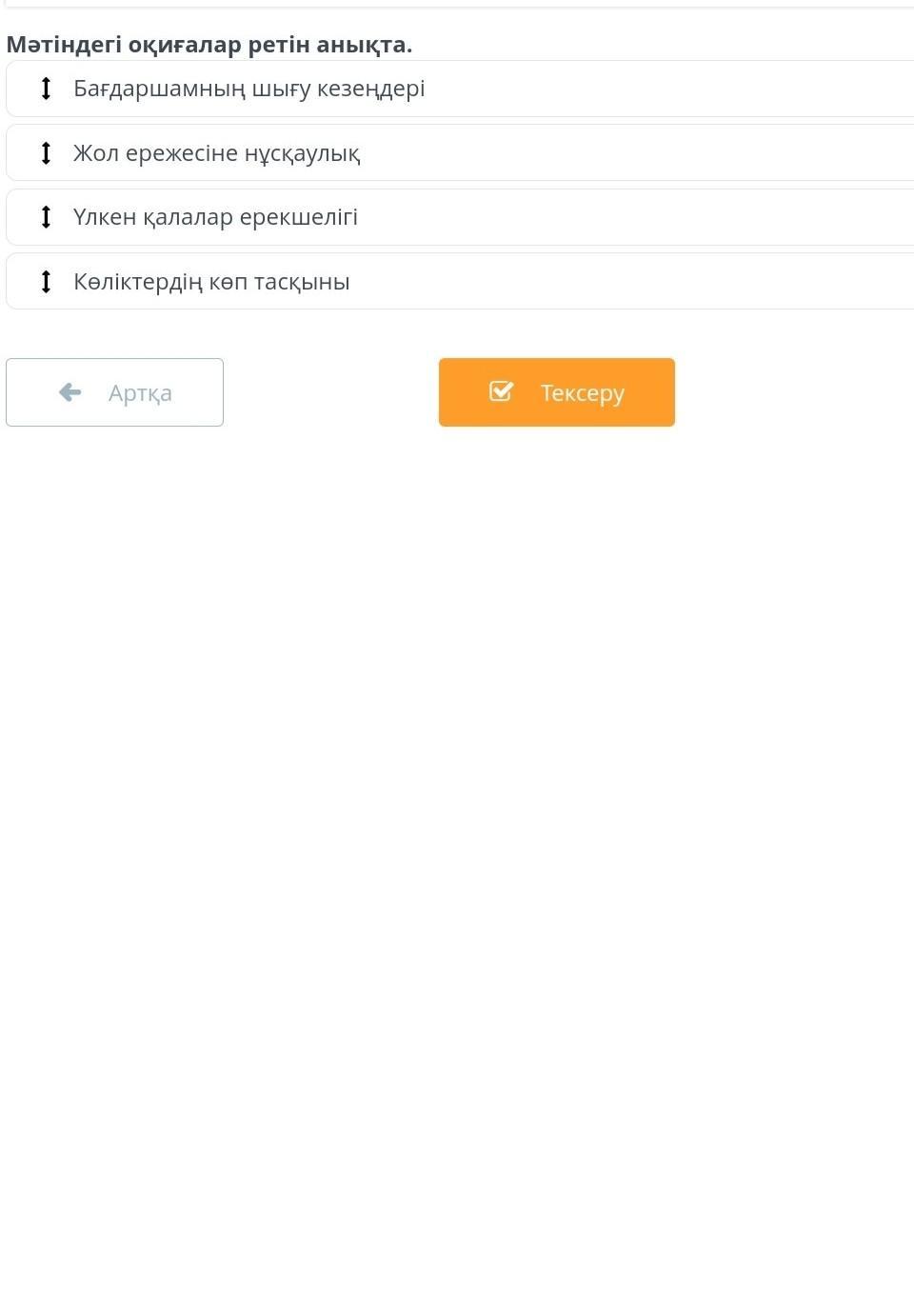 мәтіндегі оқиғалар ретін анықта бағдаршамның шығу кезеңдері жол ережесіне нұсқаулық ұлкен қалалар ерекшелігі көліктердің көп тасқыны. Помогите прошууууу!!!