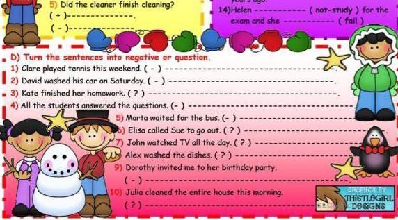 Ответ:1)Clare didn't play tennis this weekend. 2)David didn't wash his car on Saturday. 3)Did Kate finish her homework? 4)All the students didn't answer the questions. 5)Marta didn't wait for the bus. 6)Did Elisa call Sue to go out? 7)Did John watch TV all the day? 8)Did Alex wash the dishes? 9)Dorothy didn't invite me to her birthday party. 10)Did Julia clean the entire house this morning?