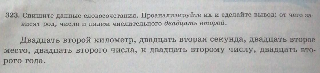 ПОМОГИТЕ ПЖ!ДАМ 20 БАЛЛОВ!!!! 323 упражнение, сделайте вывод :от чего зависят род, число и падеж числительного "двадцать второй"