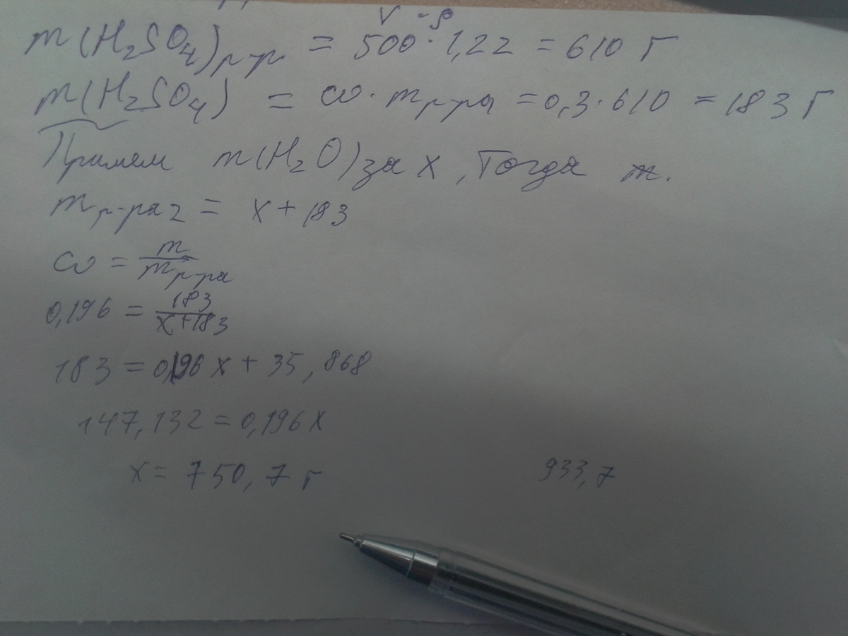 Сколько граммов воды необходимо добавить к 500 мл 30% - ного раствораH2SO4 с плотностью 1,22 г/см*3, чтобы получить 19,6% - ный раствор H2SO4 с плотностью 1,14 г/см*3 для зарядки аккумулятора?