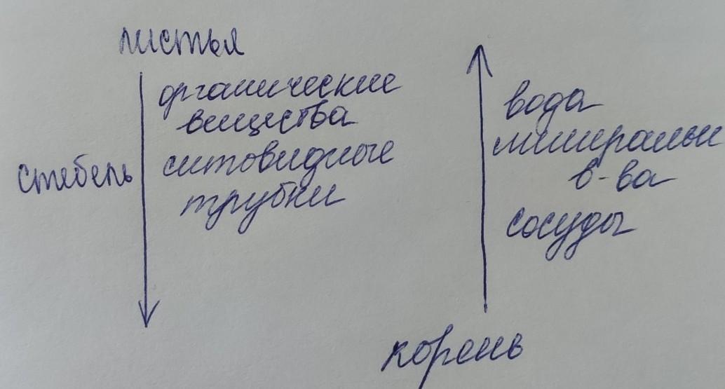 от листьев по ситовидным трубкам флоэмы происходит нисходящий ток органических веществ к корням. а восходящий ток - ток воды и минеральных веществ от корней к листьям по сосудам ксилемы.