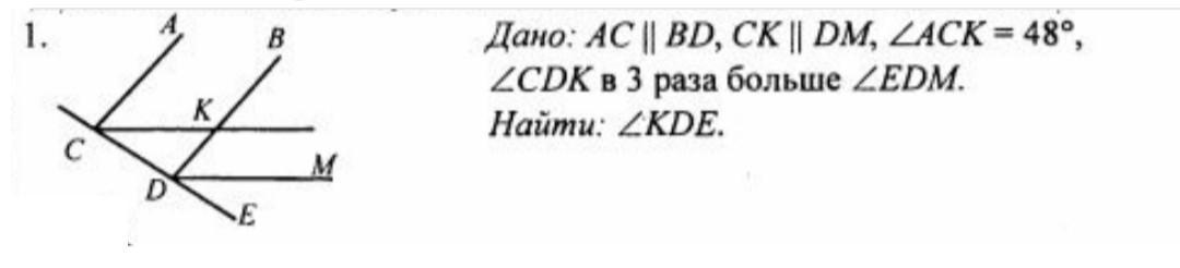 уго ЕДМ=х , тогда угол СДК=3х.Угол ВДМ=48 , как угол с сонаправленными сторонами. Значит х+3х+48=180 , тк эти три угла составляют развернутый угол.Решай уравнение.............