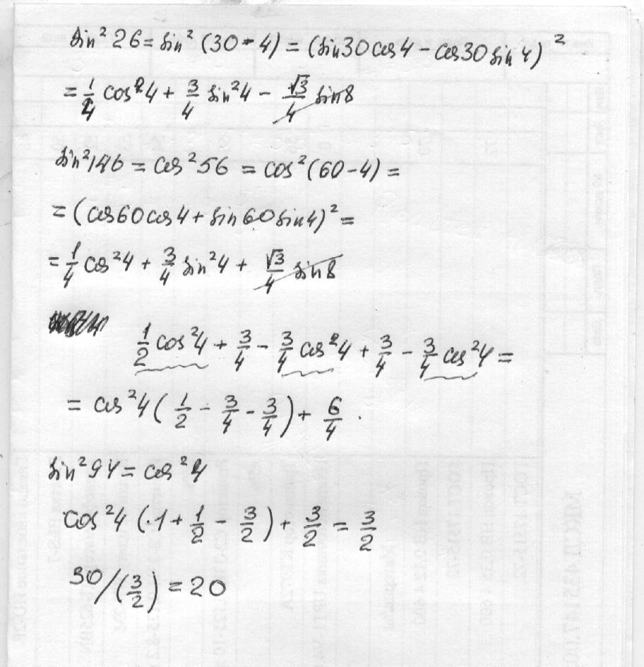 30/(sin^2 26º + sin^2 146º + sin^2 94º)