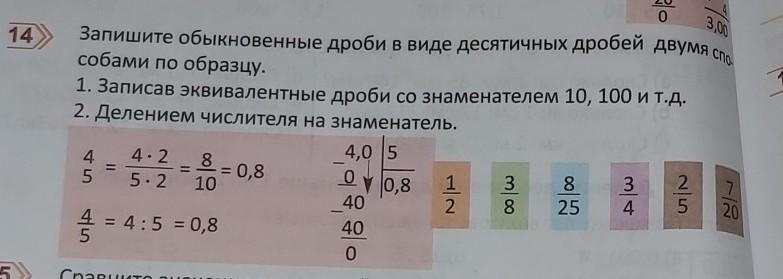 Запишите обыкновенные дроби в виде десятичных дробей двумя способами по образцу. Пожалуйста помогите