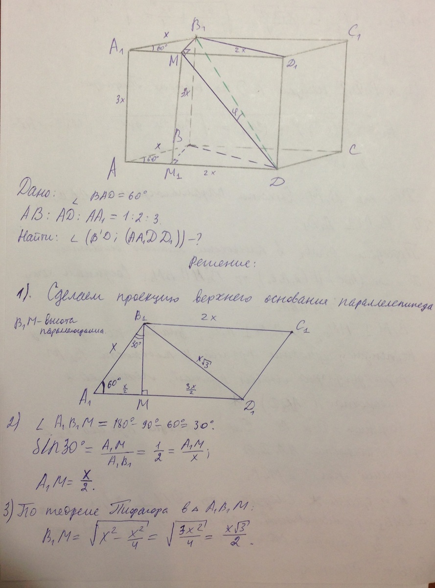 ребер АВ: АД : АА = 1: 2 : 3. Найдем угол между прямой В1 Д и