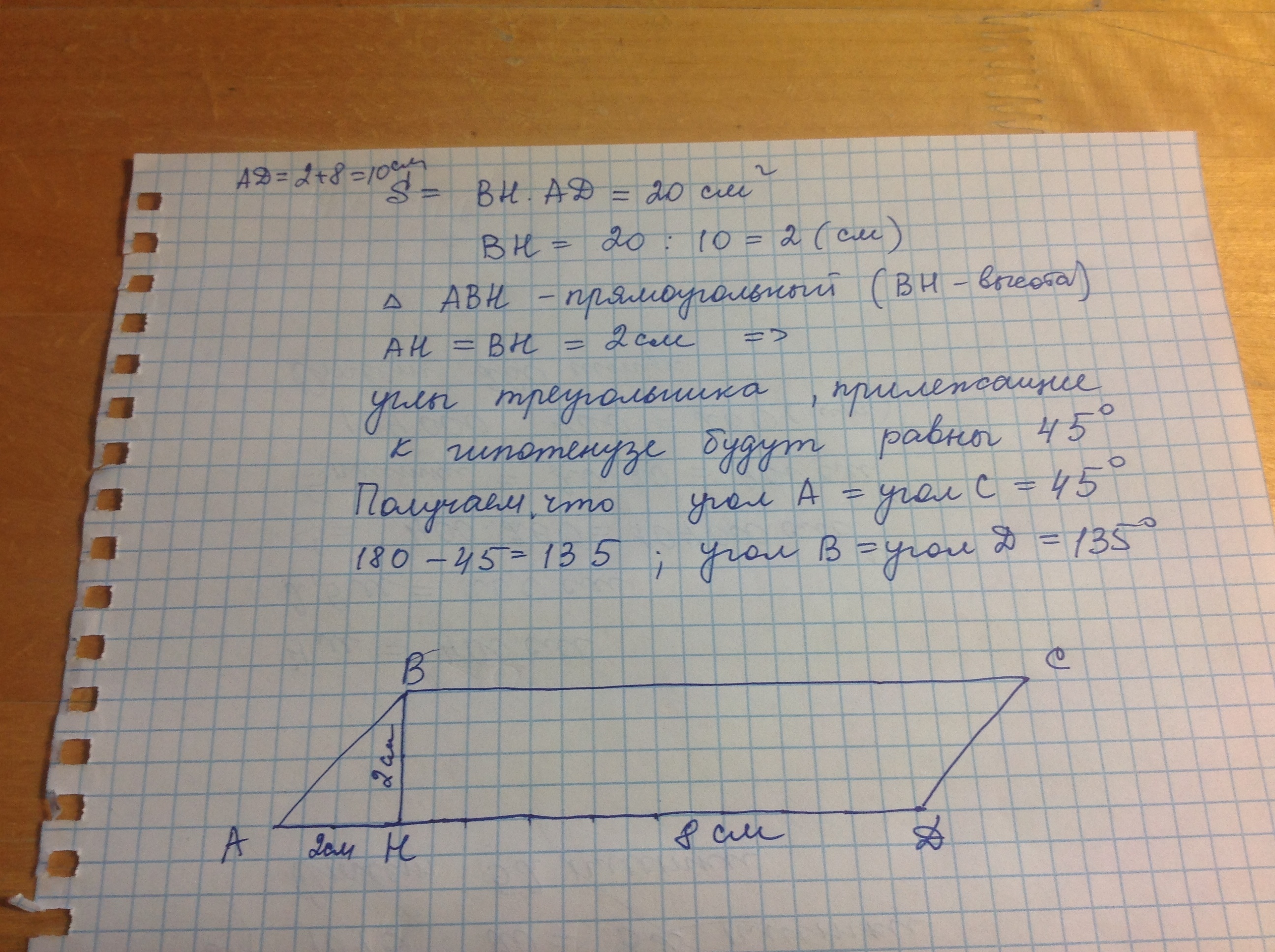 найдите углы параллелограмма если его площадь равна 20 см кв а высота проведенная из вершины тупого угла делит одну из сторон на отрезки 2 см и 8 см считая от вершины тупого угла.