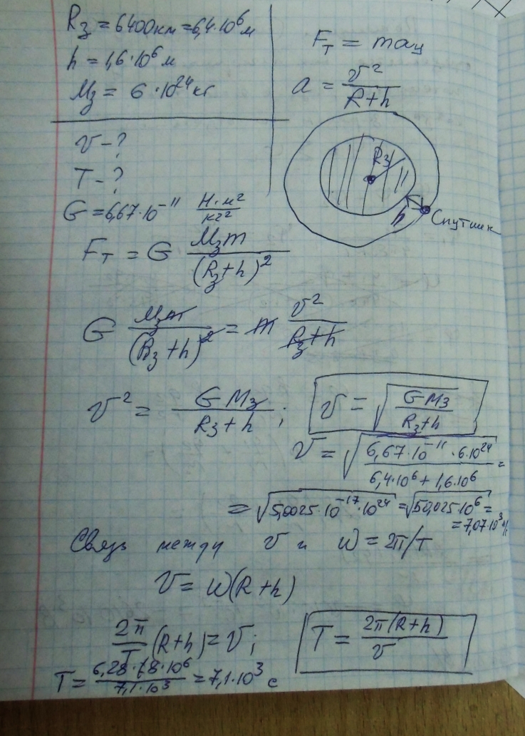 По круговой орбите, находящейся на высоте h = 1 600 км над поверхностью Земли, движется спутник Земли. Определите: 1) v - линейную скорость движения спутника; 2) T - период обращения спутника вокруг Земли.
