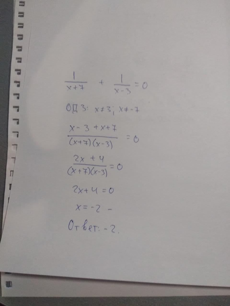 ОДЗ - область допустимых значений. Для это уравнения это -7 и 3. То есть при х = -7 или 3 знаменатель будет равен нуля, чего быть не может.