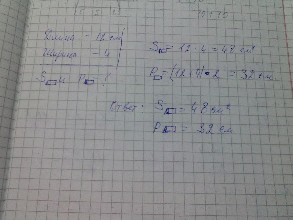 Длина прямоугольника 12см, ширина составляет 13 длины. Найдите площадь и периметр прямоугольника.