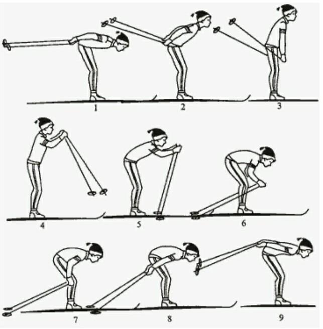 7-8. Толчок заканчивается полным разгибанием рук. Кисти рук находятся на уровне не выше колен, угол наклона палок наибольший.