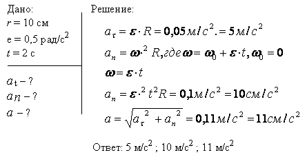 Диск радиусом R=10 см , находившийся в состоянии покоя, начал вращаться с постоянным угловым ускорением e=0,5 рад/с^2 каковы были тангенциальное, нормальное и полное ускорения точек на окружности диска в конце второй секунды после начала движения?