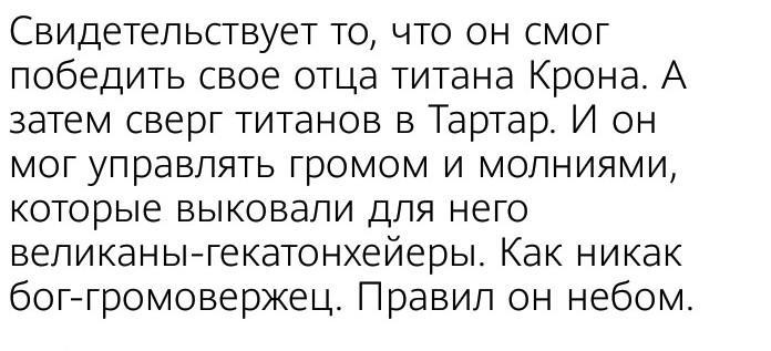 2)Свидетельствует то, что он смог победить свое отца титана Крона. А затем сверг титанов в Тартар.