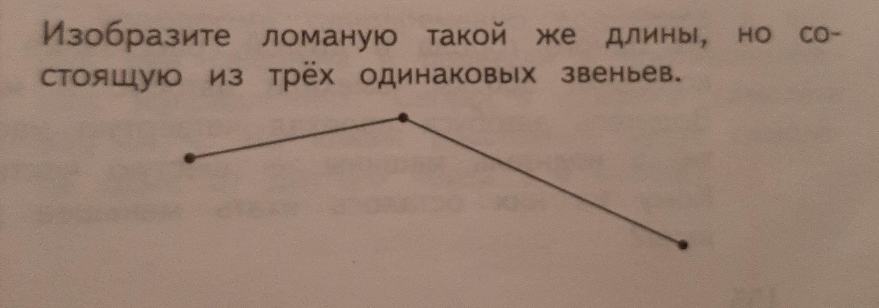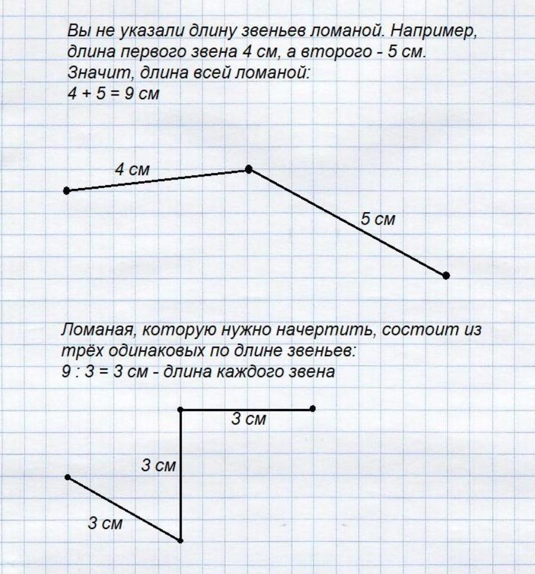 Изобразите ломаную такой же длины, но состоящую из трёх одинаковых звеньев. (Длинна 3см и 4см 5мм)