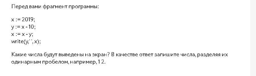 Переменная x равняется 2019 а переменная y равняется x (то есть цифра 2019) - 10 (=2009) Результат операции переменной y выводится на экран.