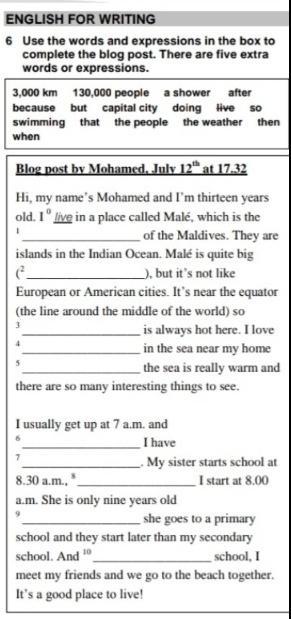 1- capital city 2- 130,000 people 3- the weather 4- swimming 5- because 6- then 7- a shower 8- but 9-so 10- after