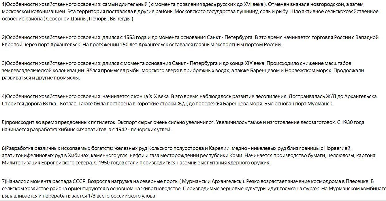 1)Особенности хозяйственного освоения: самый длительный ( с момента появления здесь русских до XVI века ). Отмечен вначале новгородской, а затем московской колонизацией. Эта территория поставляла в другие районы Московского государства пушнину, соль и рыбу. Шло активное сельскохозяйственное освоение района ( Северной Двины, Печоры, Вычегды )