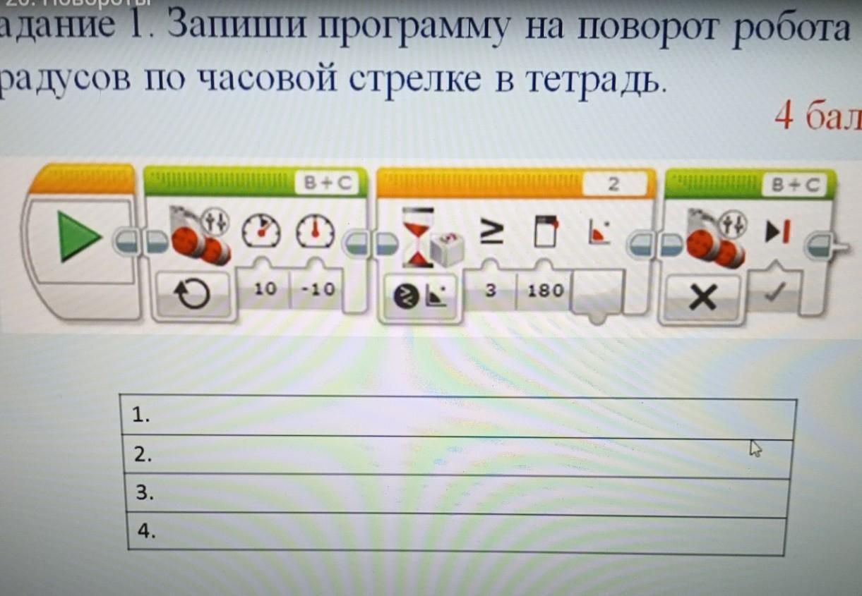 задание 1. Запиши программу на поворот робота на 180 градусов по часовой стрелке в тетрадь. помогите пожалуйста дам 15 баллов