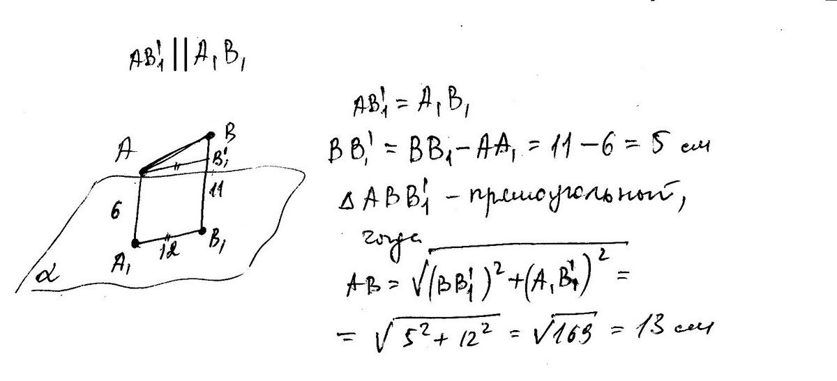 Отрезок AB не пересекает плоскость α через точки A и B проведены прямые, перпендикулярные к плоскости α и пересекающие её в точках A1 и B1 соответственно. Найдите AB, если A1B1=12 см, BB1=11 см, AA1=6 см.