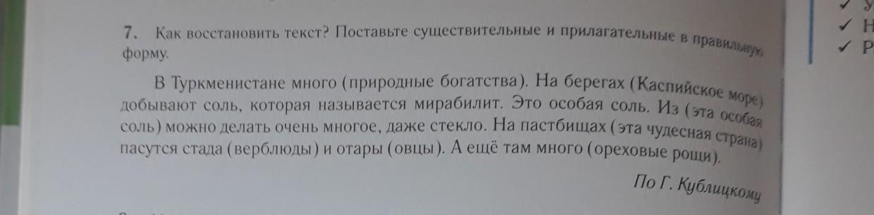 В Туркменистане много природных богатств. На берегах Кайспийского моря добывают соль, которая называется мирабилит. Это особая соль. Из этой особой соли можно делать очень многое, даже стекло. На пастбищах этой чудесной страны пасутся стада верблюдов и отары овец. А ещё там много ореховых рощей.