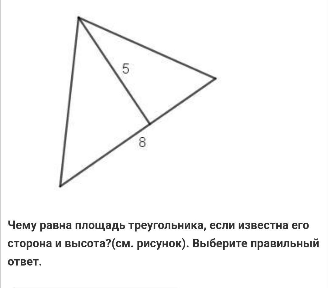 Чему равна площадь треугольника, если известна его сторона и высота?(см. рисунок). Выберите правильный ответ.