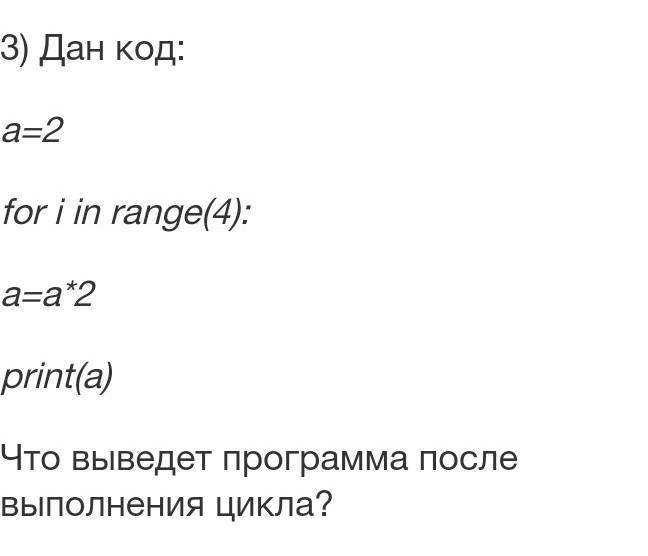 3) Дан код: a=2 for i in range(4): a=a*2 print(a) Что выведет программа после выполнения цикла?
