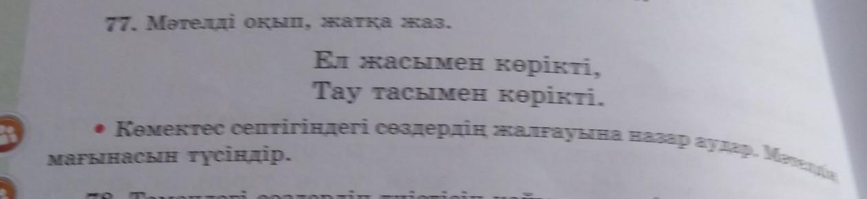 Бұл мақал-мәтел. Көмектес септігіндегі сөздер.: жасы-мен, тасы-мен. Көмектес септигинин жалгаулвры мен, пен