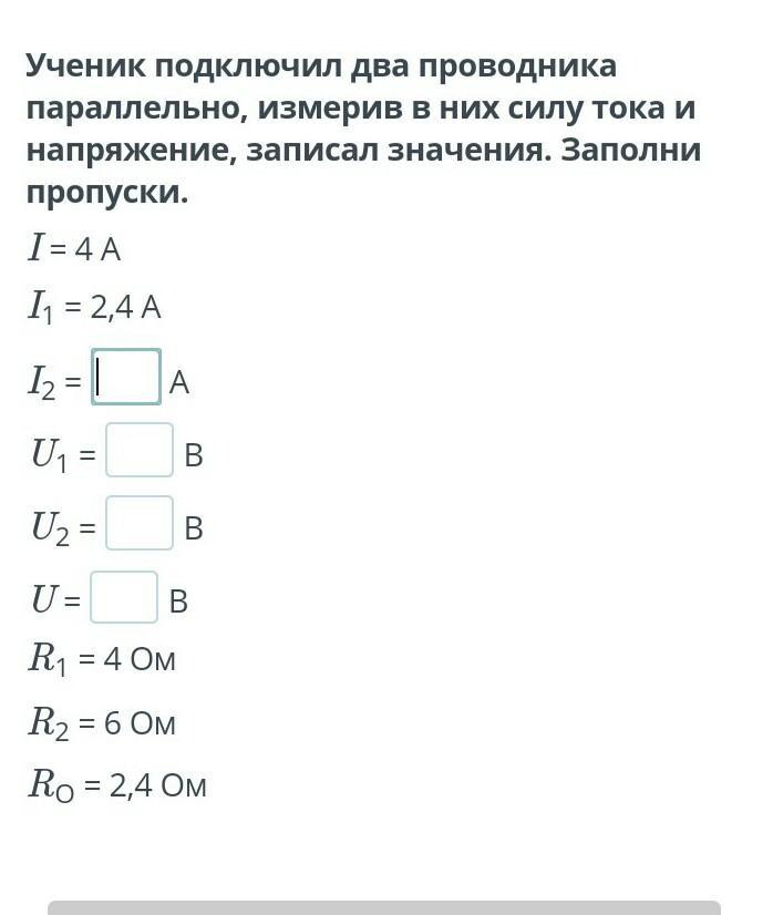 Ученик подключил два проводника параллельно, измерив в них силу тока и напряжение, записал значения. Заполни пропуски.