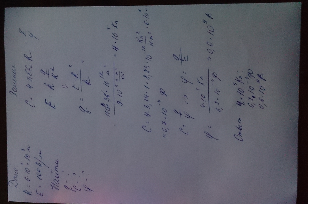 Определить заряд, емкость и потенциал Земли, считая ее шаром радиусом 6*10^3 км и зная, что напряженность поля около поверхности равна