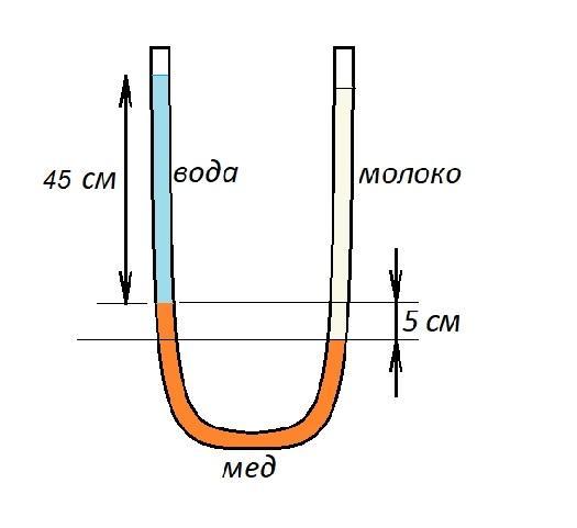 В U – образную трубку налили сначала мед. Затем в левое колено была налита вода, а в правое – молоко. Известно, что высота столба воды – 45 см, а уровень меда в левом колене на 5 см выше, чем в правом. Какова высота столба молока?