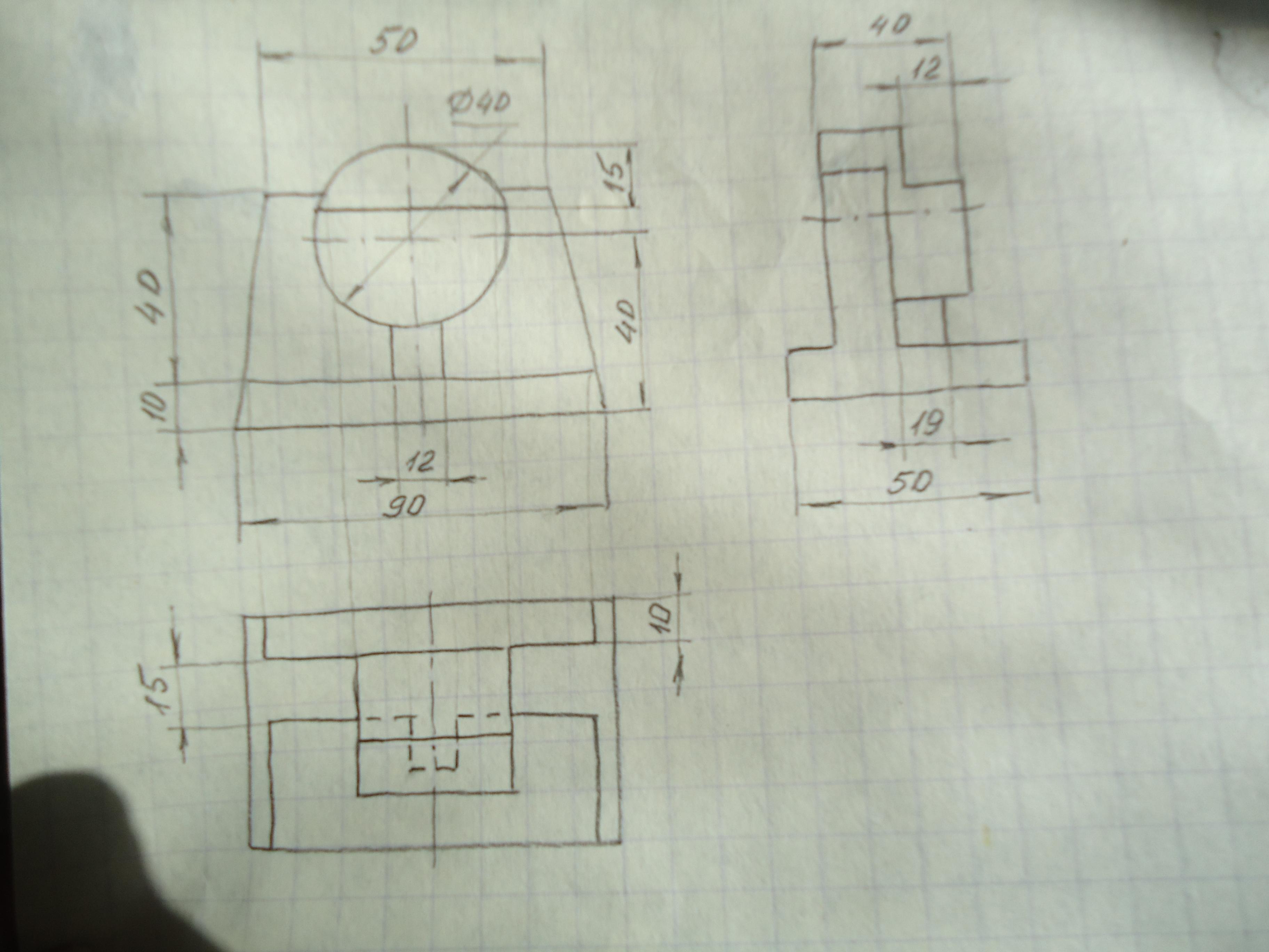Чертёж из трёх проекций, выполненный от руки с сохранением пропорций на глаз, смотрите на фото.