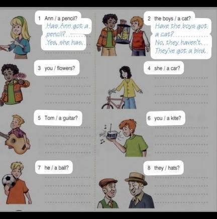 1 Ann / a pencil? Has Ann got a Yes, she has pencil? 3 you / flowers? 5 Tom / a guitar? 2 the boys a cat? Have the boys got a cat? No. they. haven't... They've got a bird, 4 she /a car? 6 you/a kite? 7 he/a ball? 8 they / hats?о