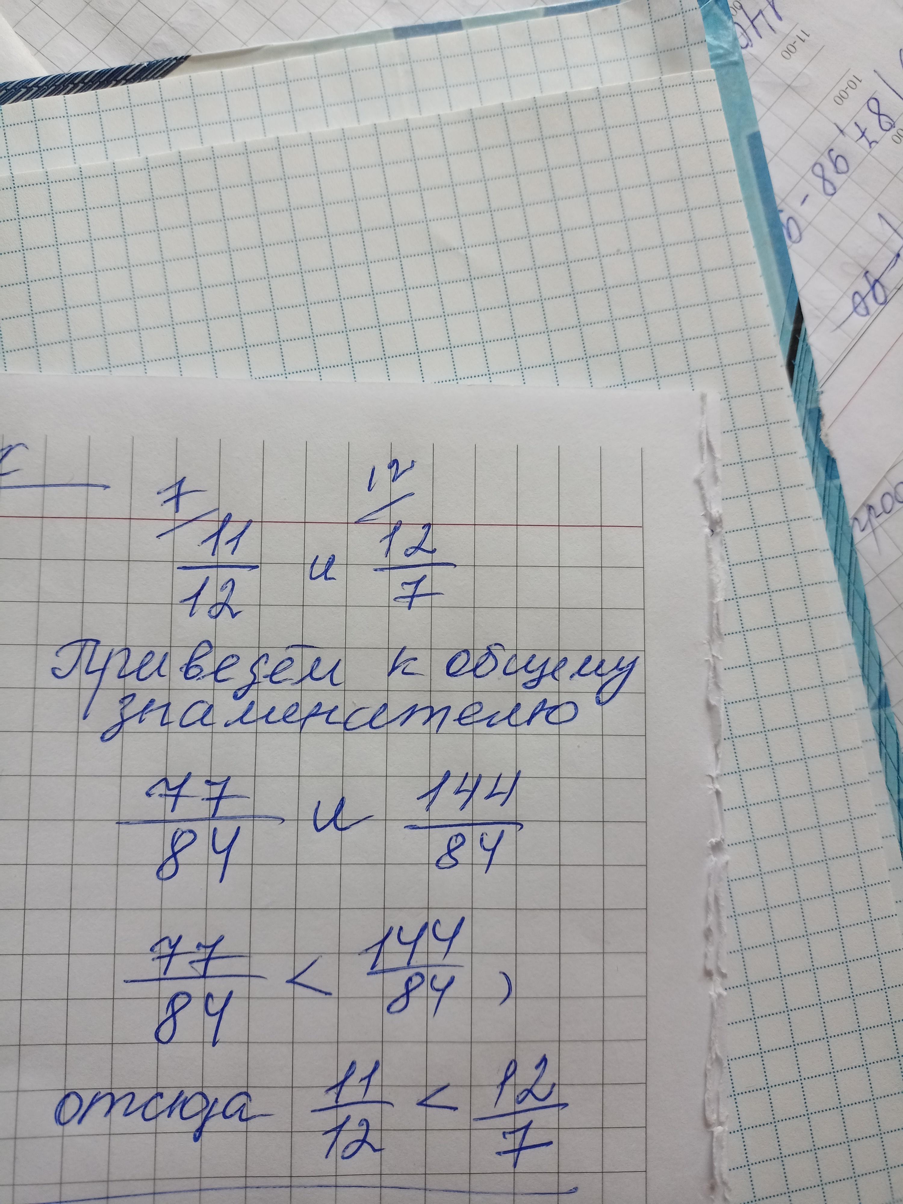 11/12 и 12/7 получается 11/12•7 = 77/84 12/7•12=144/84 77/84<144/84 получается 11/12<12/7