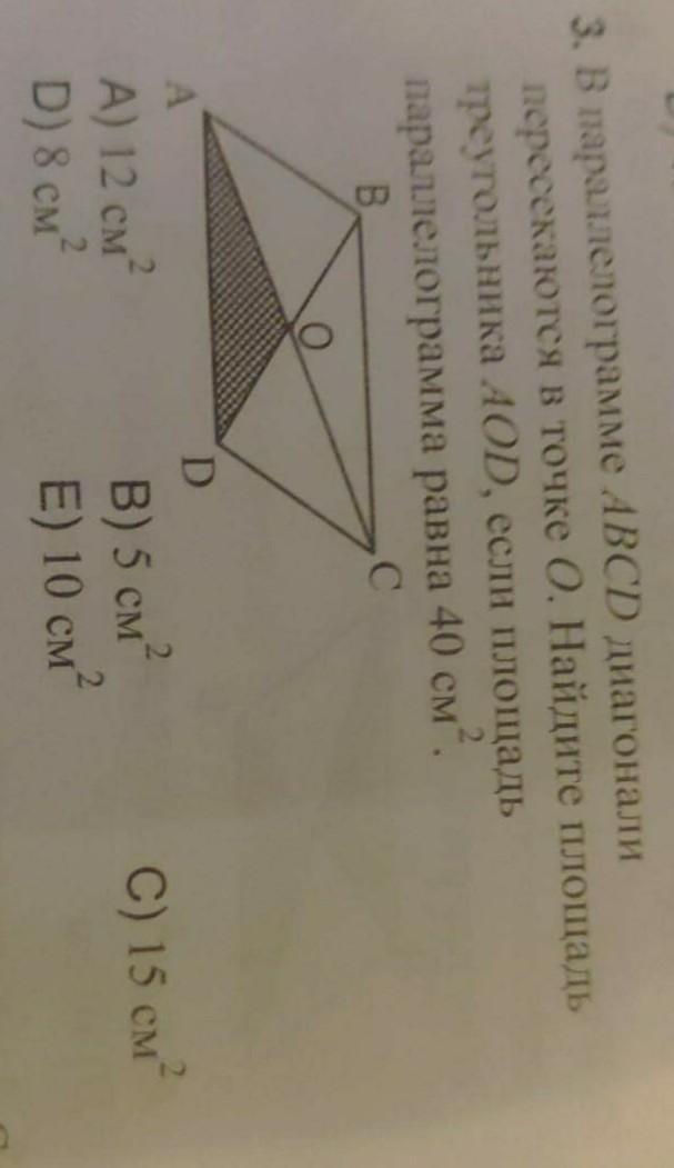 Площадь треугольника AOD: S2 = AD * 1/2h * 1/2 = 1/4 AD*h = 1/4 S1 = (40 см^2)/4=10см^2.